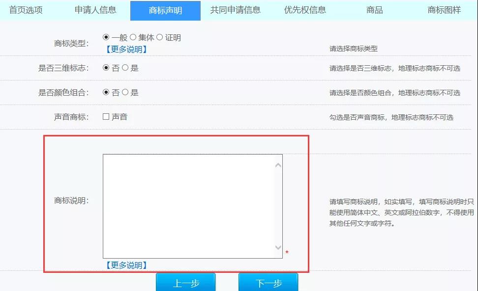 如果申報的是有有相關(guān)的提交材料附件,可以在“商標說明”中加以文字提示。需要后補的,也可在此予以說明,提示審查員查閱補充材料部分。